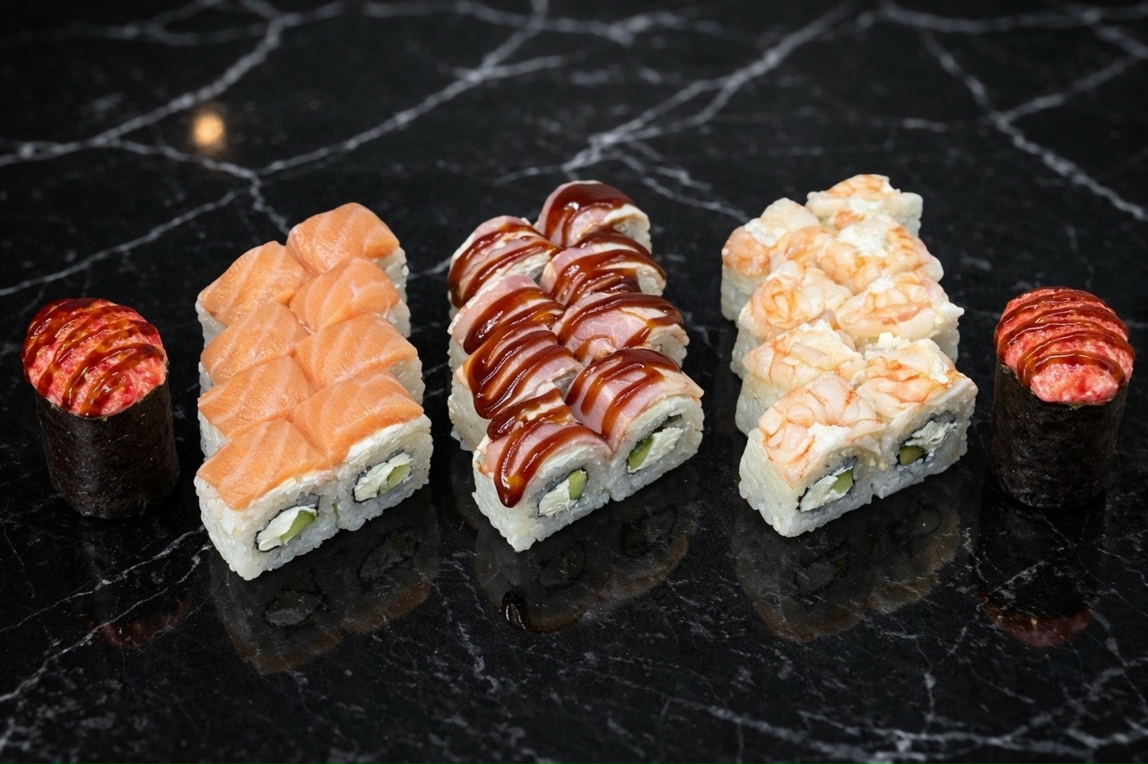 Ролл Филадельфия, Ролл Европейский, Ролл Филадельфия с Креветкой, Гунган Запечённый с Креветкой, Гунган Запечённый с Крабом. 800гр