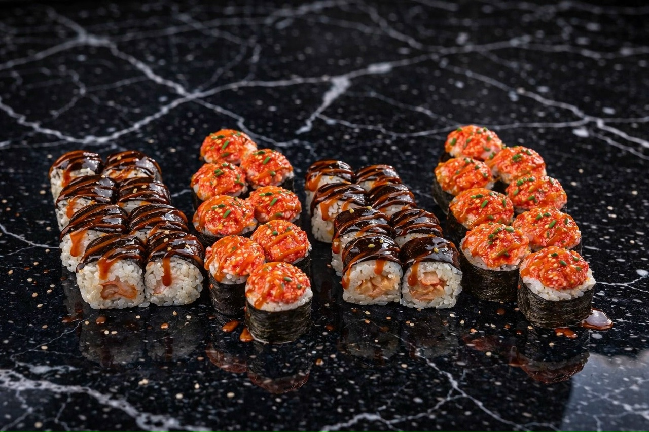 ролл Европейски, Запечённая калифорния, Калифорния в кунжуте, Маки с Креветкой.